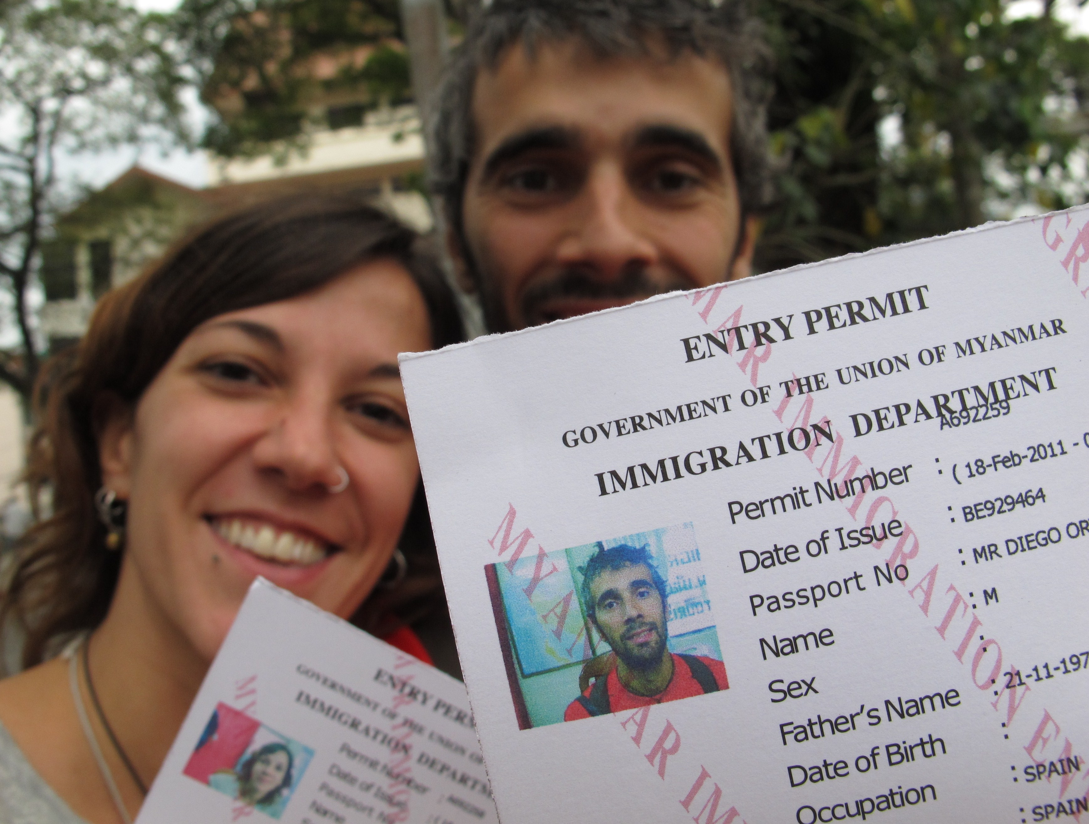 Mae Sai es poco más que una calle larga repleta de puestos que venden de todo (desde comida hasta electrónica) y que termina en la frontera. Así que, caminando entre las tiendillas, llegas al primer control, haces la salida oficial de Tailandia con el correspondiente sello del poli tailandés y atraviesas un puente que cruza el río Mae Nam Sai, frontera natural entre los dos países. Al otro lado del puente entras en un cuartito que pone «foreigners» y entregas tu pasaporte y los 500 baths por cabeza. Te sientan en una silla frente al ordenador, te hacen una foto y te dan un pasaporte como de mentirijillas impreso allí mismo con tu imagen típica de webcam de esas en las que sales estupendo… El poli myanmarense te pregunta con sonrisilla cómplice si «shopping» y tú dices «yes yes» muy convencido y te manda para fuera. ¡Pues ya estás en Myanmar, así que hala, de ‘shopping’!