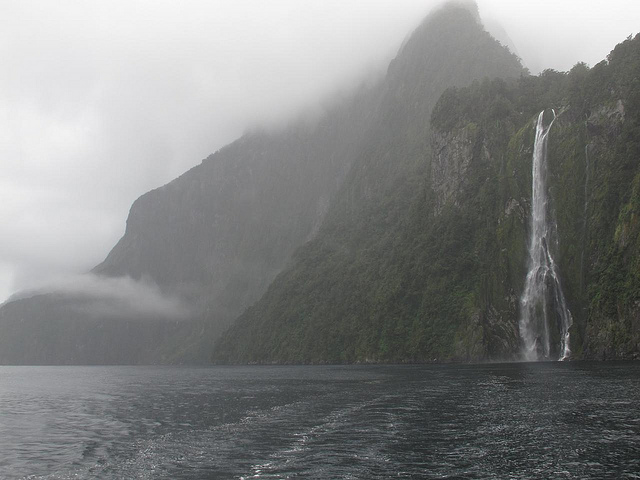 Con la nieve, el frío (esa noche tuvimos 3 grados dentro de la furgo y salía vaho al respirar) y los problemas de Mickie para subir puertos a más de 40 km/h, decidimos coger un bus+barco para ver los fiordos de Milford Sound. Pasamos la noche aparcados en un hostel para poder disfrutar de la cocina calentita, y el día 18 tocó madrugar. El camino hacia la zona de los fiordos es precioso desde el principio y comienza a convertirse en espectacular a partir de Te Anau. La carretera avanza flanqueada por montañas y bosques como selvas, con decenas de cascadas salpicando las laderas, riachuelos, lagos… La salida del Homer Tunel es impresionante: de pronto te ves rodeado por todas partes por el Cleddau Valley y sus montañas negras. Al llegar a Milford ya estábamos alucinando y todavía faltaba el recorrido en barco. Hacía frío y lloviznaba, pero el paseo por los fiordos fue una maravilla, entre cataratas altísimas, acantilados verdes, focas y hasta delfines. Tras la vuelta en bus, recogimos a Mickie del hostel y emprendimos camino hacia Wanaka bajo una luna llena que iluminaba más que los faros del coche.